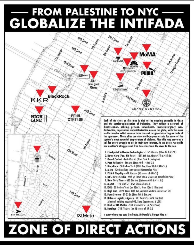 "From Palestine to NYC - Globalize the Intifada Zone of Direct Actions" reads a map with instructions on where key institutions owned by people of Jewish decent.